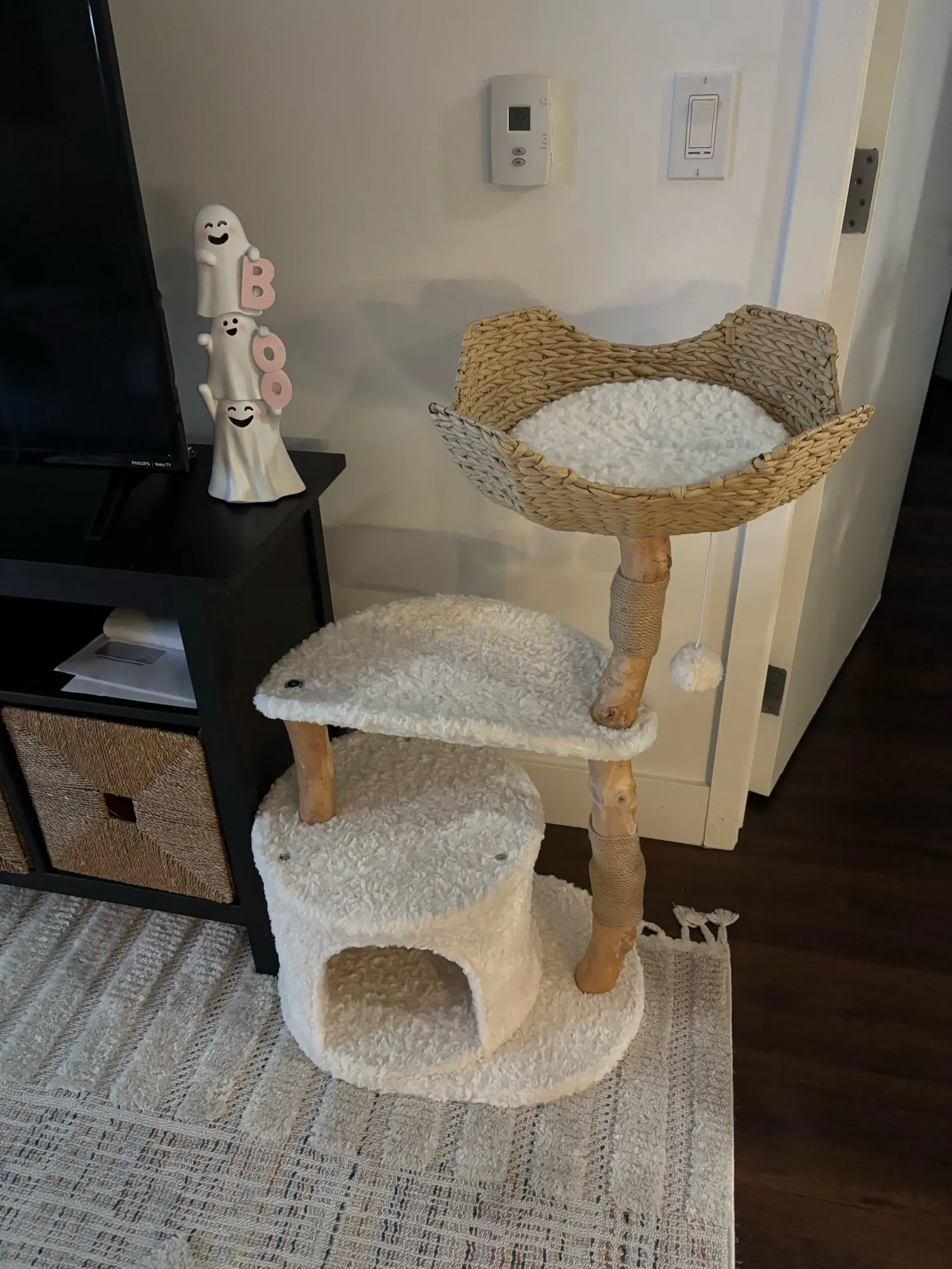 - Luxurious and Elegant - The solid wood scratching post provides a sleek design, while the plush fabric and basket cat bed add a sophisticated touch to your home, in addition to providing comfortable resting spots for your cat. The condo offers a private place for sleeping.
